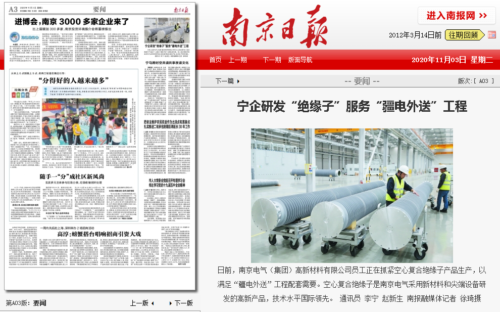 10月28日和11月3日,南報(bào)融媒旗下的紫金山新聞客戶端和南京市委黨報(bào)《南京日?qǐng)?bào)》分別對(duì)南京電氣研發(fā)生產(chǎn)空心復(fù)合絕緣子新產(chǎn)品、服務(wù)國(guó)家重點(diǎn)工程做了報(bào)道。 10月28日,“紫金山新聞”發(fā)布消息《南京電氣研...