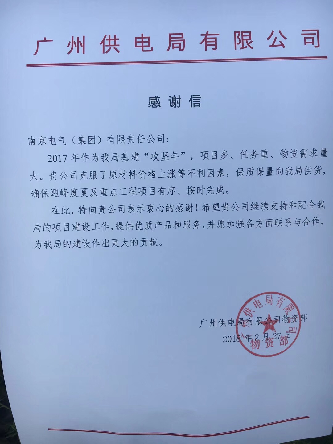 廣州供電局有限公司近日向南京電氣(集團(tuán))有限責(zé)任公司發(fā)來感謝信,對南京電氣去年保質(zhì)保量向該局供貨、確保迎峰度夏及重點(diǎn)工程項(xiàng)目按時(shí)完成表示感謝。 感謝信說,2017年作為我局基建“攻堅(jiān)年&...